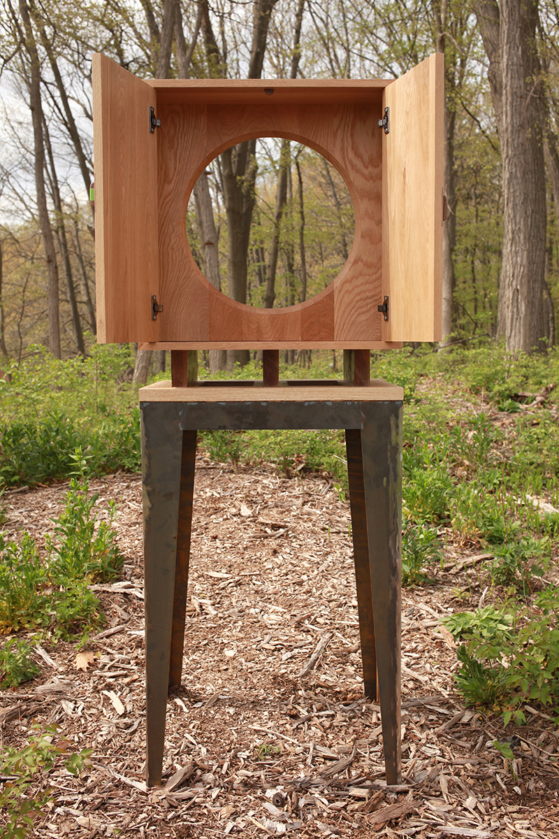 The Both/And Box is a piece of furniture that functions more as a question than an answer by balancing oppositional forces in relation to use, orientation, geometric order and material finish. Inset doors are located in both the ‘front’ and ‘back,’ creating a double-sided condition that liberates the cabinet from standard applications. There is no one logical orientation in a room, but rather a multiplicity of possibilities. This situation is further exacerbated by a circular aperture that both divides and extends the interior spatial logic. It can frame views. It can highlight objects of art. It can store things, or not. This functional fluidity celebrates concepts of contradiction and ambiguity embraced in the design practices of Gio Ponti and Venturi Scott Brown.