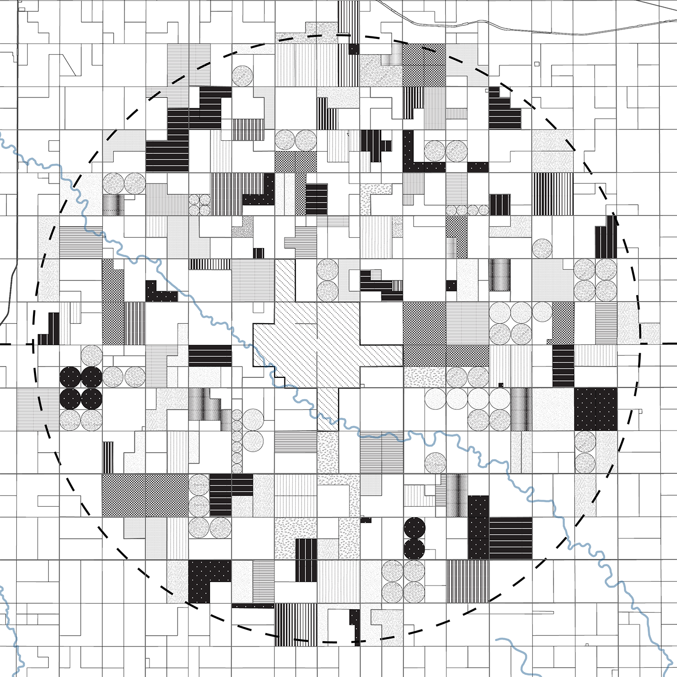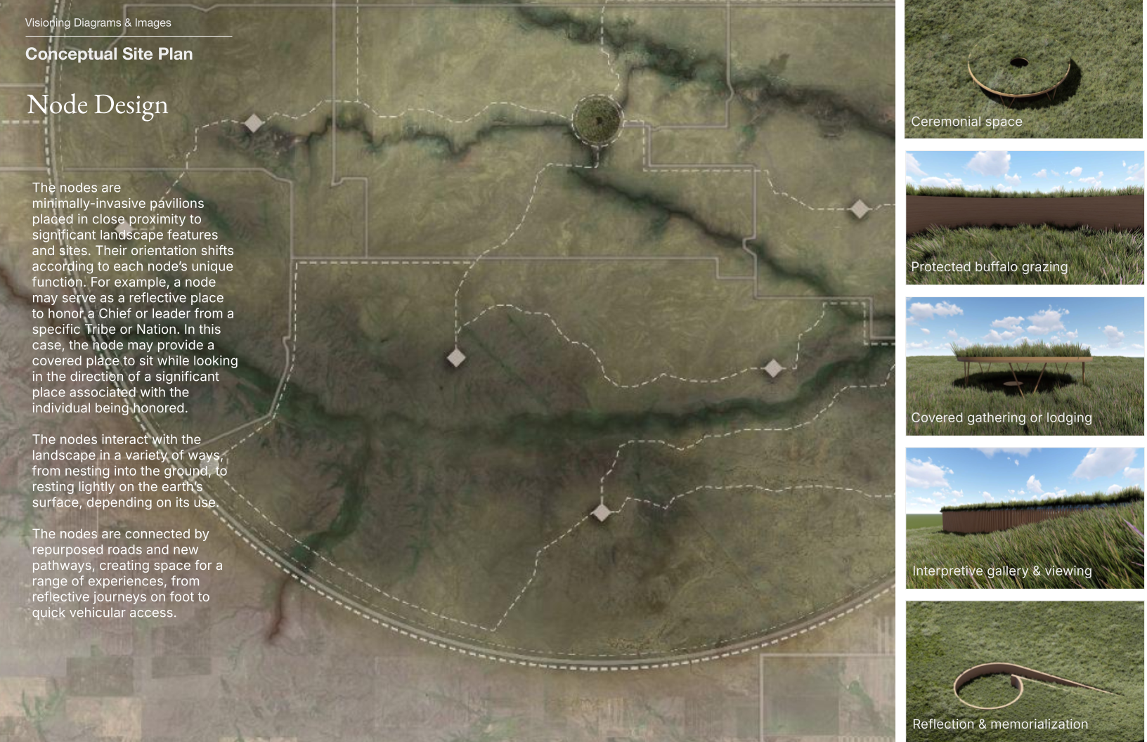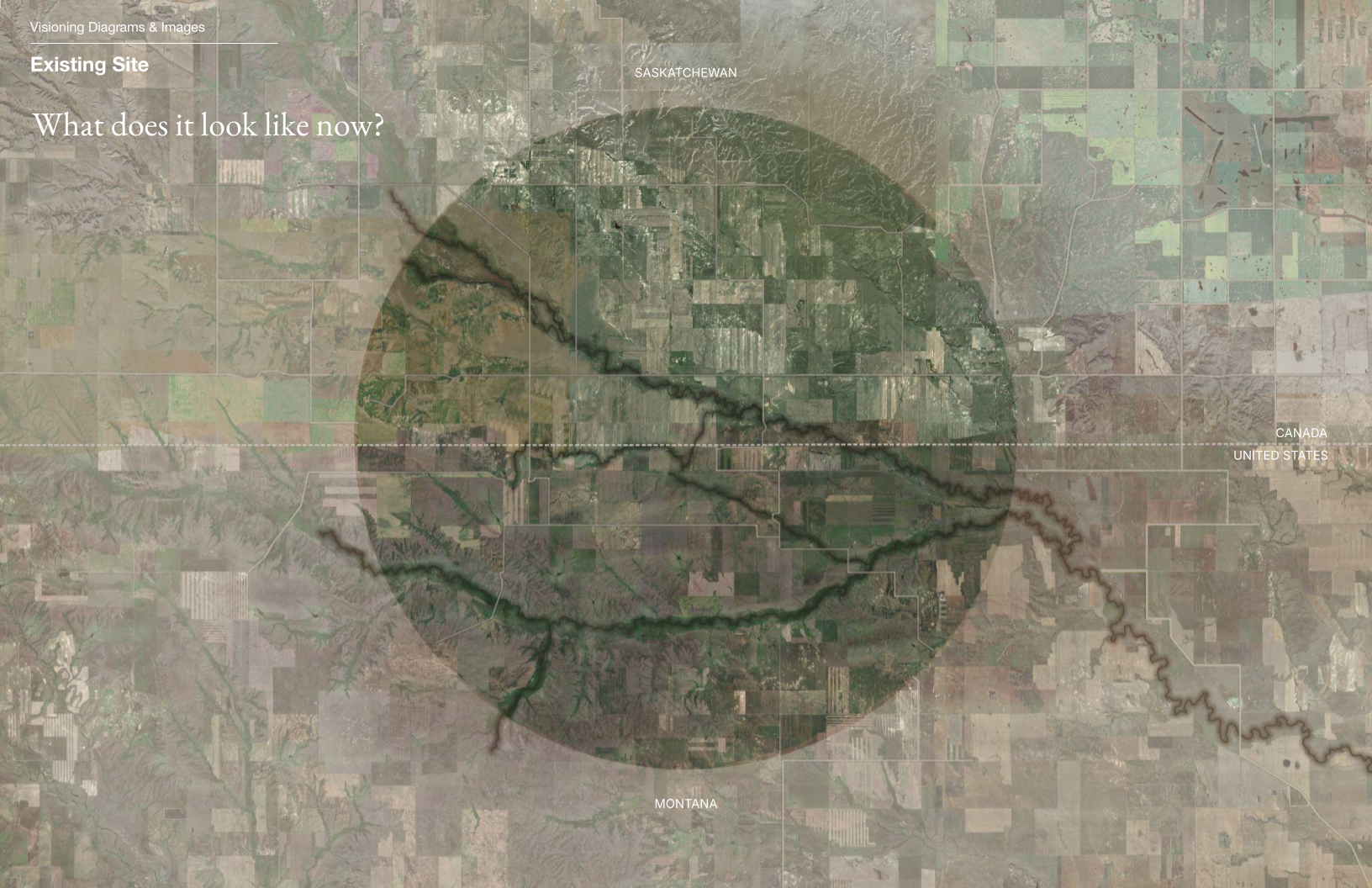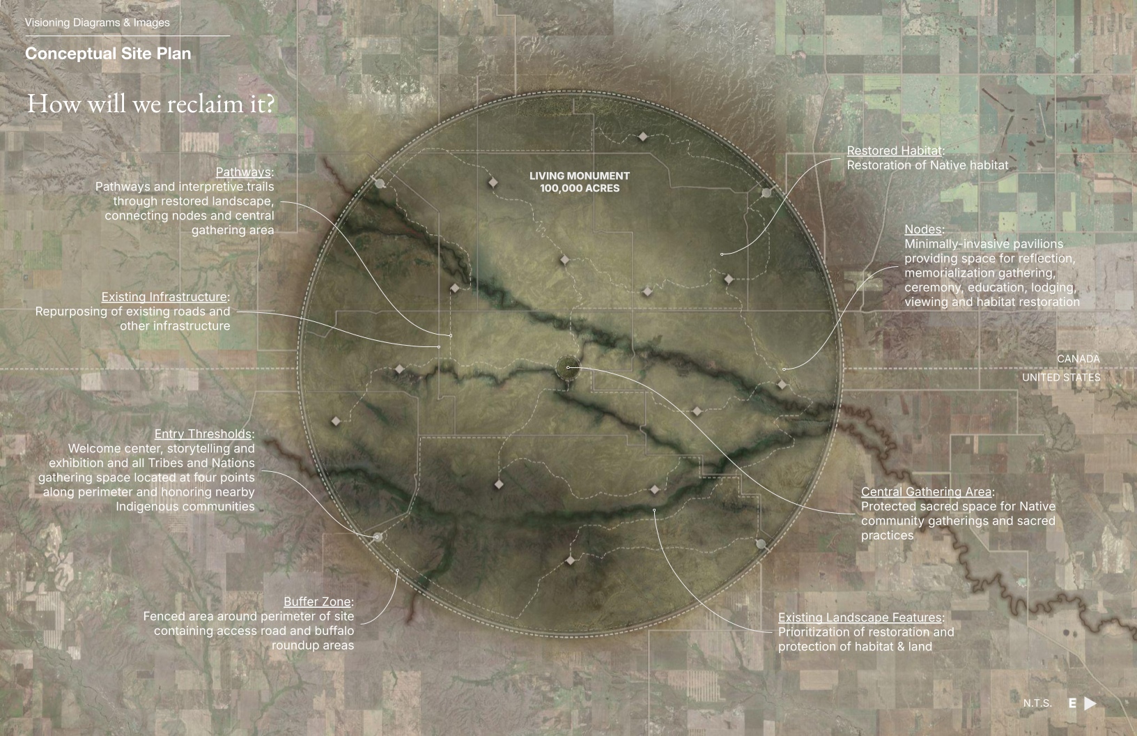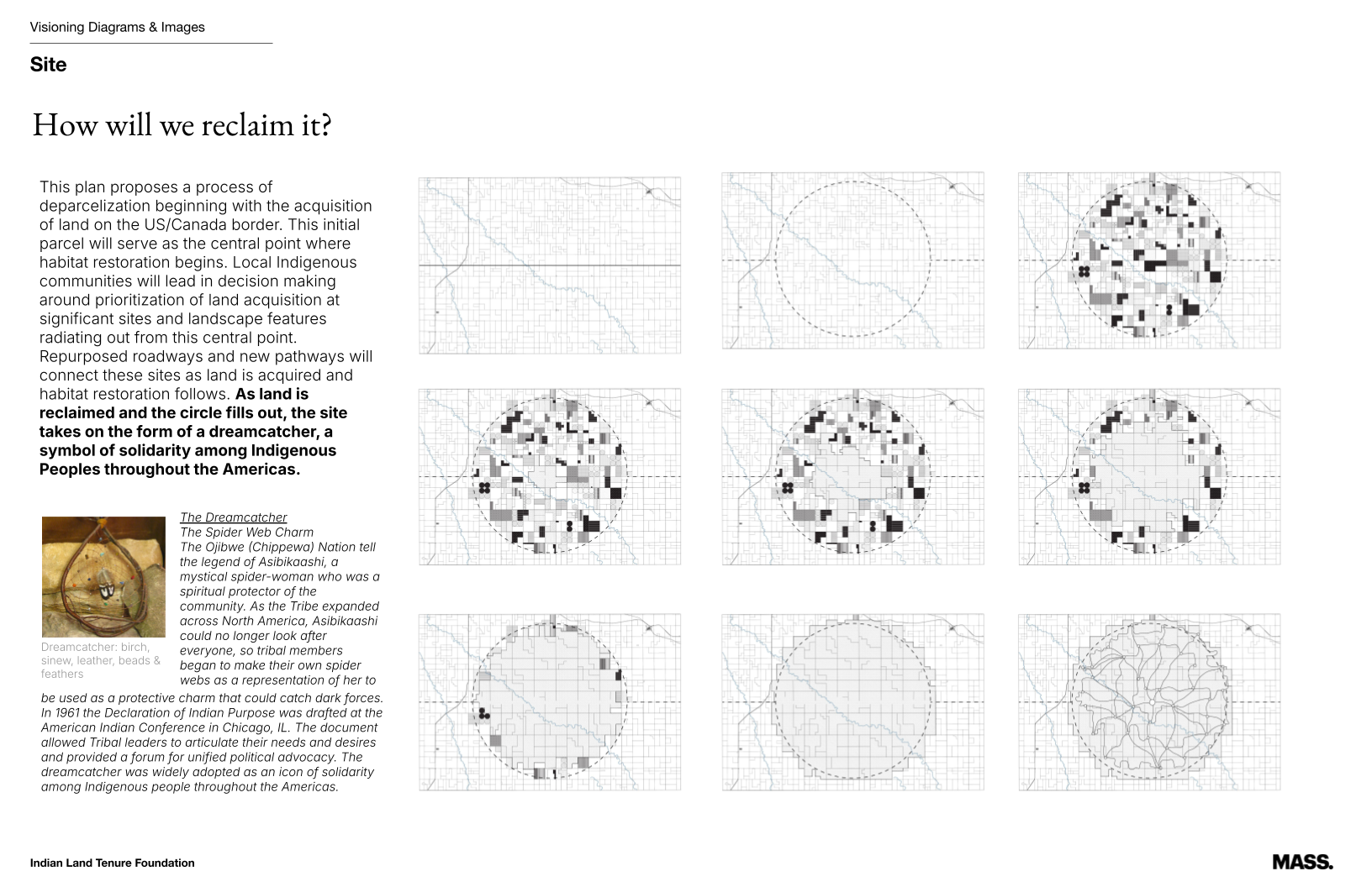 This plan proposes a process of deparcelization beginning with the acquisition of land on the US/Canada border. This initial parcel will serve as the central point where habitat restoration begins. Local Indigenous communities will lead in decision making around prioritization of land acquisition at significant sites and landscape features radiating out from this central point. Repurposed roadways and new pathways will connect these sites as land is acquired and habitat restoration follows. As land is reclaimed and the circle fills out, the site takes on the form of a dreamcatcher, a symbol of solidarity among Indigenous Peoples throughout the Americas.